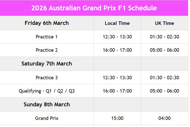 Below is the 2026 Australian GP schedule for free practice, qualifying and race sessions over the weekend.