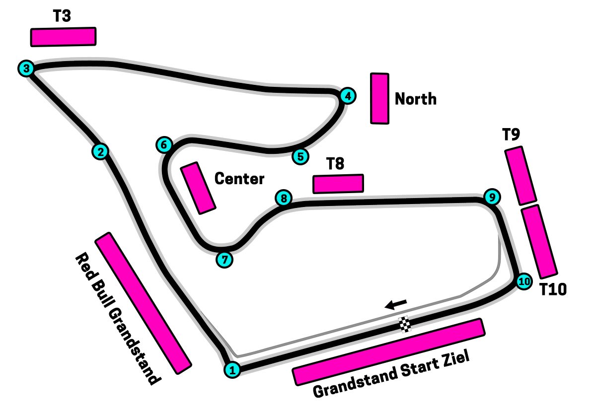 There are 10 different grandstands to choose from at the Austrian Grand Prix, held at the Red Bull Ring in Spielberg. Of these grandstands only two are covered – the Start / Ziel stand and the Nord stand.