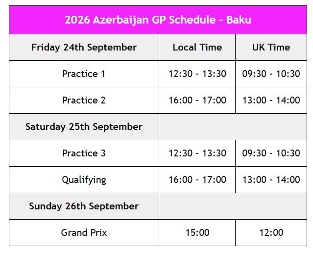 | 2026 Azerbaijan GP Schedule - Baku | ||