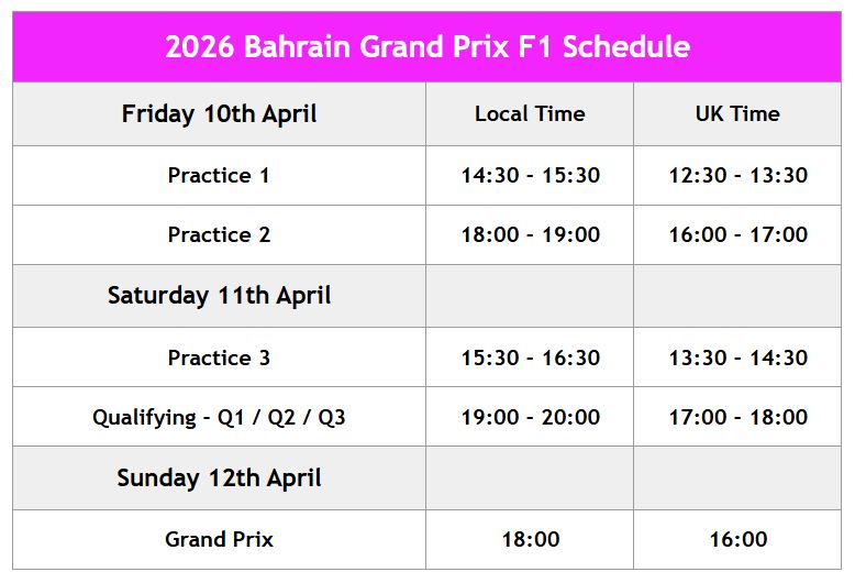 The 2026 Bahrain GP will start at 18:00 (6pm) local time on Sunday 12th April.
