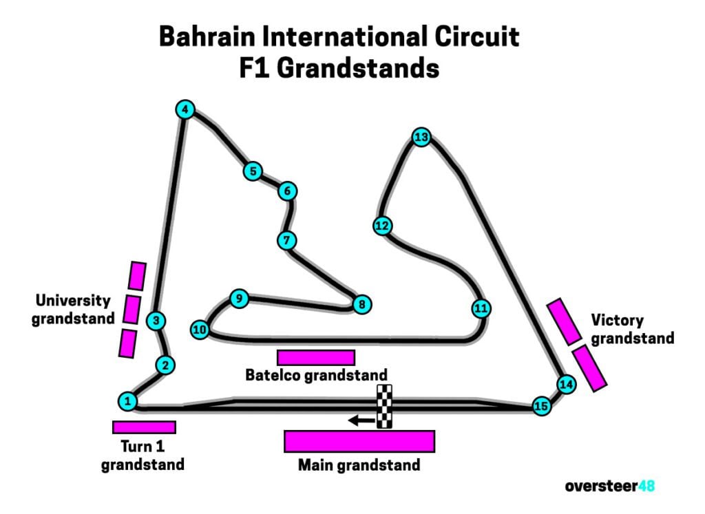 Unlike all the other F1 circuits, there is no general admission ticket option at the Bahrain Grand Prix, held at the Bajrain International Circuit (also known as the Sakhir circuit). Instead, you have a choice of 5 different grandstands to sit in:
