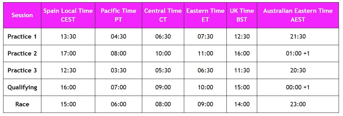 The Barcelona-Catalunya GP takes places near Barcelona, Spain. This is in the Central European Summer Time (CEST) zone which is UTC+2.