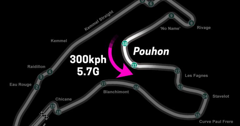 Pouhon Spa is one of the fastest corners in F1, where drivers experience close to 5 G and apex at almost 300kph. Here’s all the details.