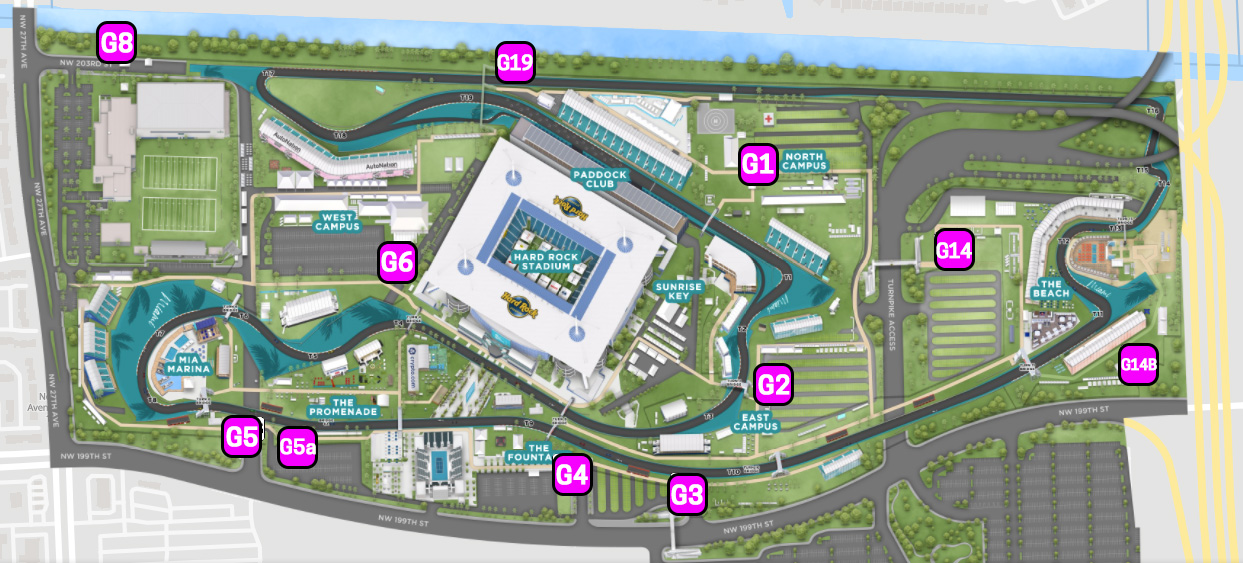 Below is a custom Google Map which shows the external spectator entrance gates around the Hard Rock Stadium Miami F1 campus.