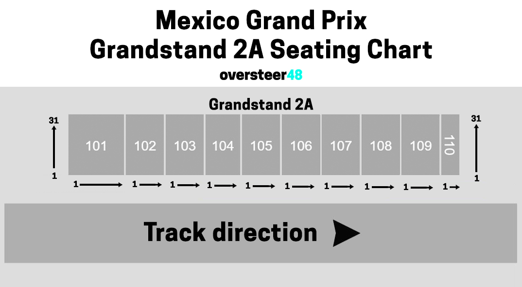 The image below shows the seat plan for Grandstand 2A at the Autodromo Hermanos Rodriguez during the Mexican Formula 1 weekend.