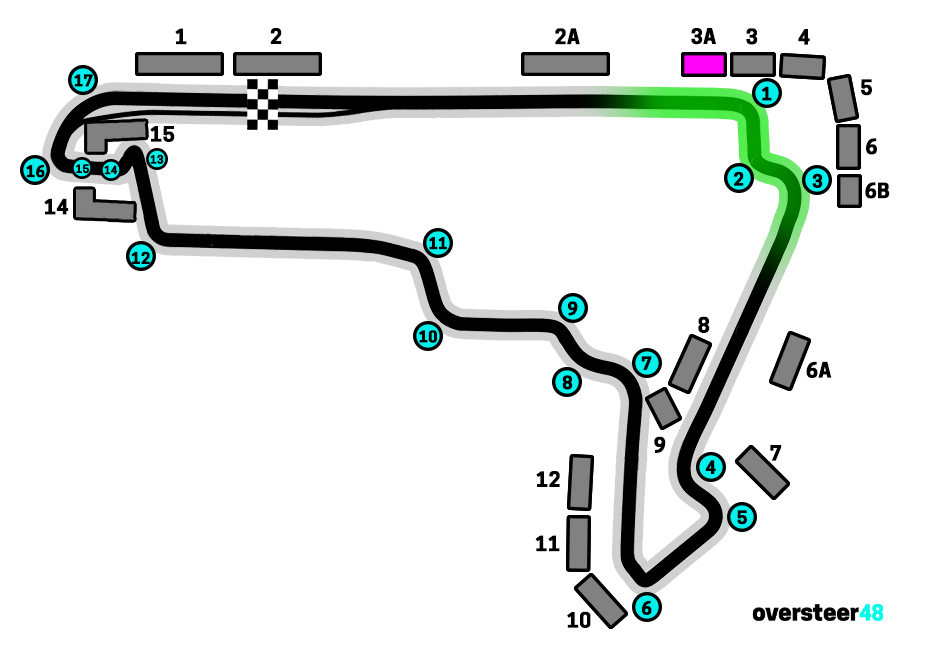 As the image shows, not only do you get a view of the braking zone at the end of the incredibly long main straight, but if you sit in the right place you can also see all the way through turns 1, 2 and 3 which make up the first chicane, known as Curva Moises Solana.