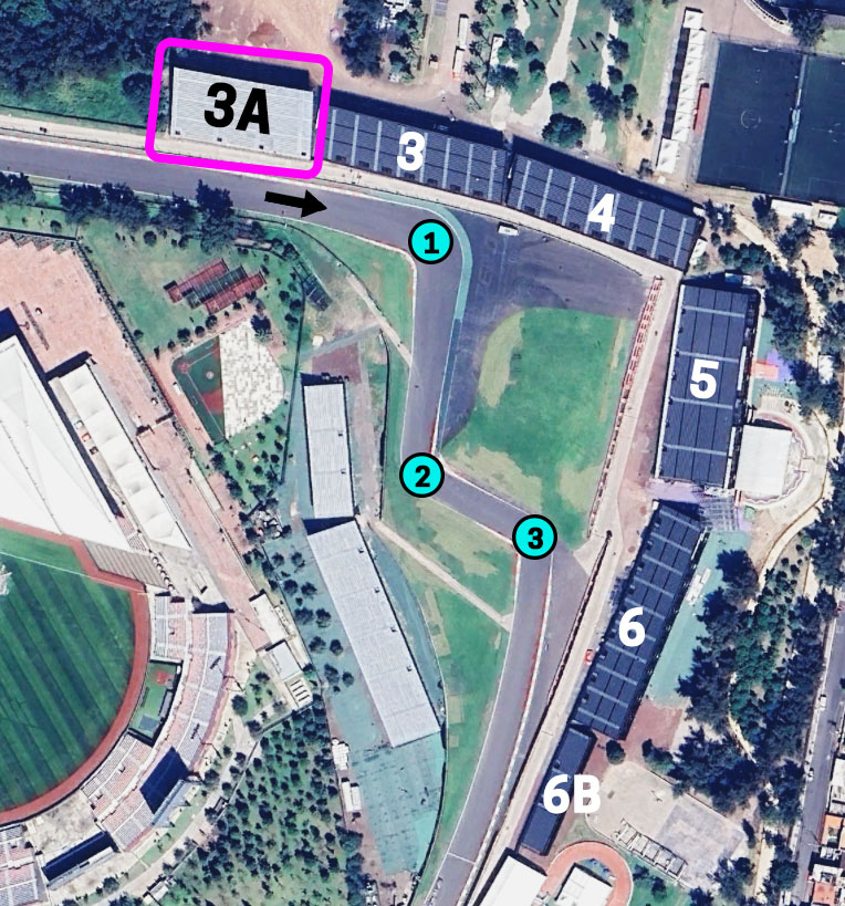 Grandstand 3A, also known as Grada 3A, at the Autodromo Hermanos Rodriguez circuit is positioned on the left hand side of the track at the end of the very long start finish straight, right in the braking zone for Turn 1. It’s adjacent to Grandstand 3 which is to its left.