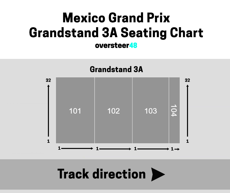 The image below shows the seat plan for Grandstand 3A at the Autodromo Hermanos Rodriguez during the Mexican Grand Prix weekend: