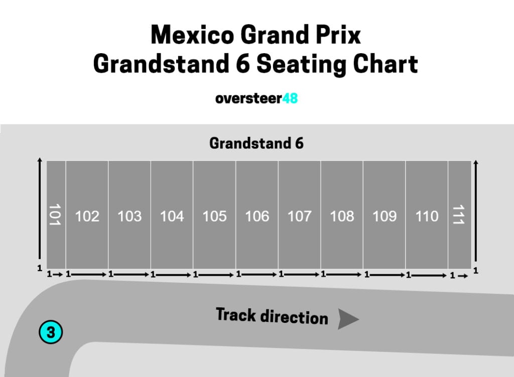 The image below shows the seating chart for Grandstand 6 at the Autodromo Hermanos Rodriguez for the Mexican Grand Prix event: