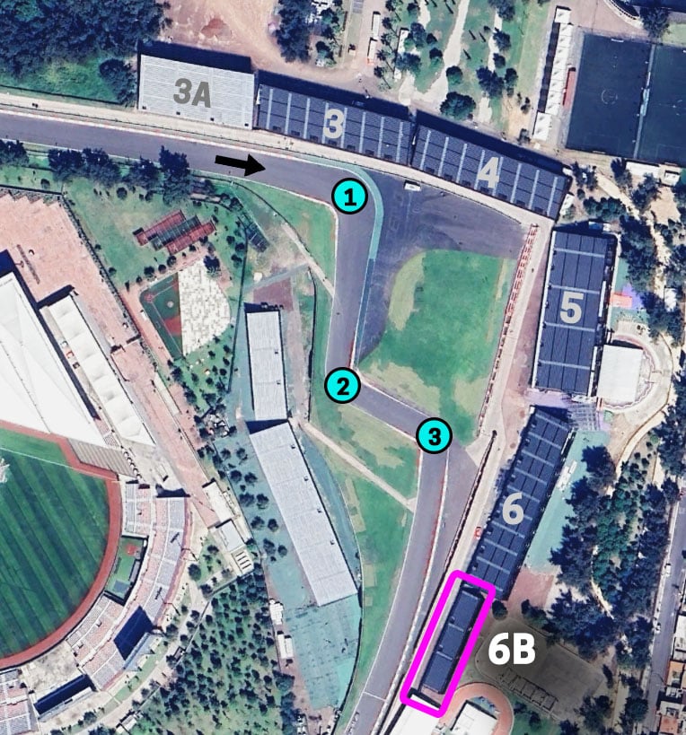 Grandstand 6B, also known as Grada 6B, at the Autodromo Hermanos Rodriguez race circuit is on the outside of the track just after Turn 3, which is the final part of the first chicane. This grandstand runs parallel to the circuit along the straight between turns 3 and 4.
