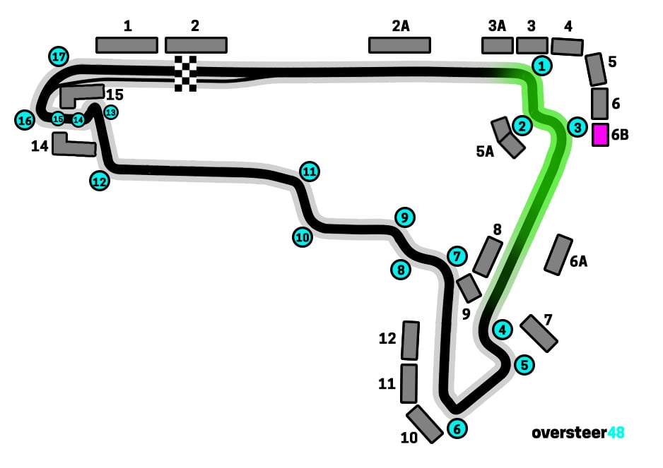 The map below shows the parts of the circuit you can see from this grandstand in green: