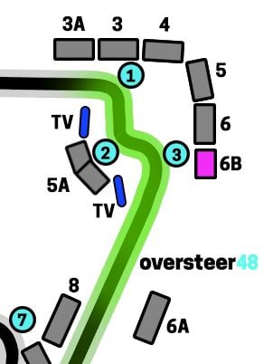 As the seating plan shows grandstand 6B is made up of three sections – 102, 103 and 103. Section 102 is closest to the exit of Turn 3 and Section 104 is furthest away from it.