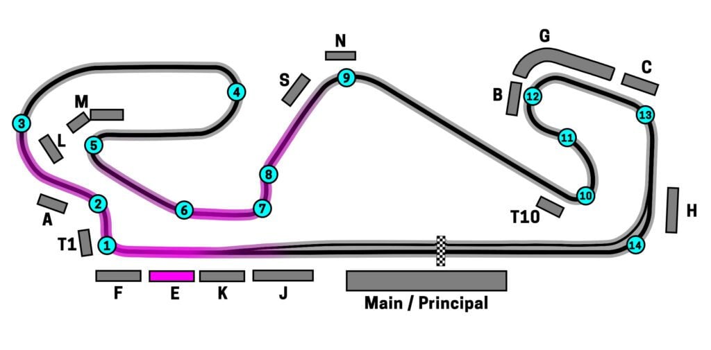 The image below shows the areas of the track visible from Tribuna E highlighted in pink.