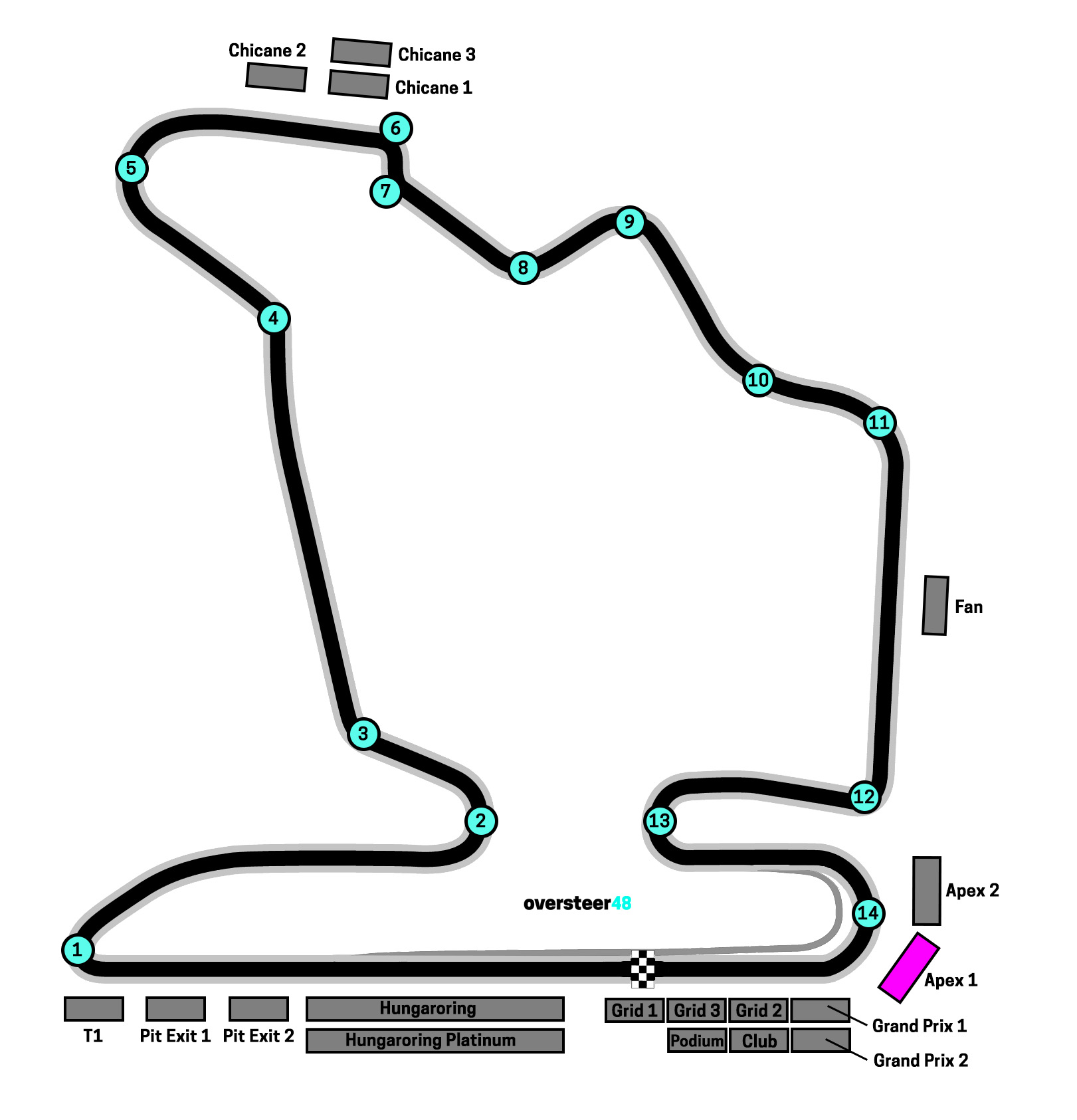 The Apex 1 grandstand is on the outside (left-hand side) of Turn 14, the final corner on the Hungarian Grand Prix circuit. It’s adjacent to the Grand Prix 1 grandstand (to its left) and the Apex 2 grandstand to its right.