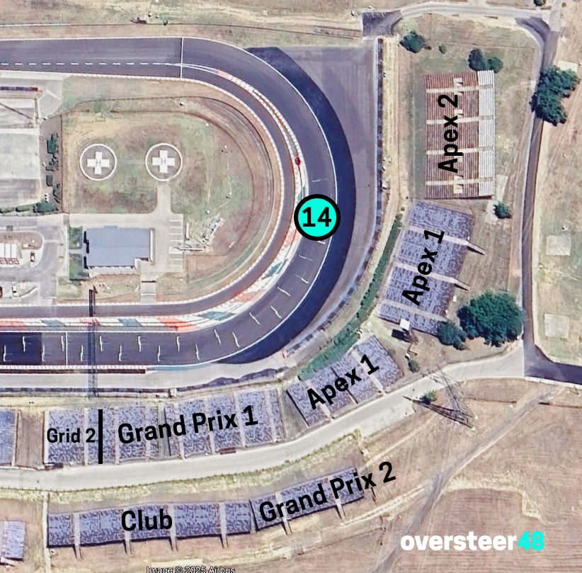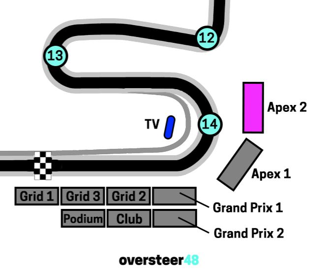 As the image shows, Apex 2 gives you a fantastic view of the final corner, Turn 14. You also have a glimpse of the straight before Turn 12, then an even better view of the short straight just after it.