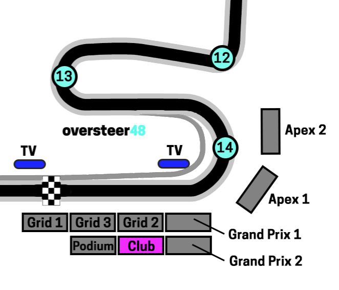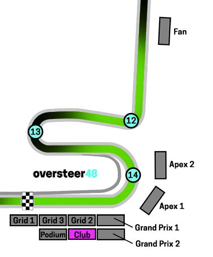 Being high up, you get a great view of the final corner and the run on to the start / finish straight. Additionally, you can see the straight before Turn 12, and a little bit just after that corner.