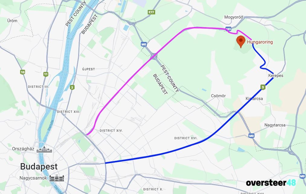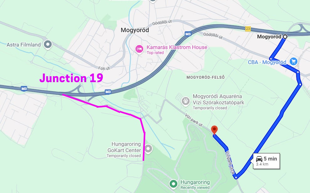 To drive to the track it’s likely you’ll take the M3 motorway (which does need an e-vignette) which goes right past it. The normal exit you would take for the Hungaroring is Exit 19. However, during the Grand Prix weekend, this is the exit all the traffic will take. On Saturday and Sunday in particular taking that exit can mean you sit in gridlock for an hour to cover the 1km from there to the track.