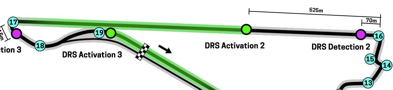 The detection point for the third DRS zone is 15 metres after Turn 17. The activation point is directly on the apex of Turn 19.