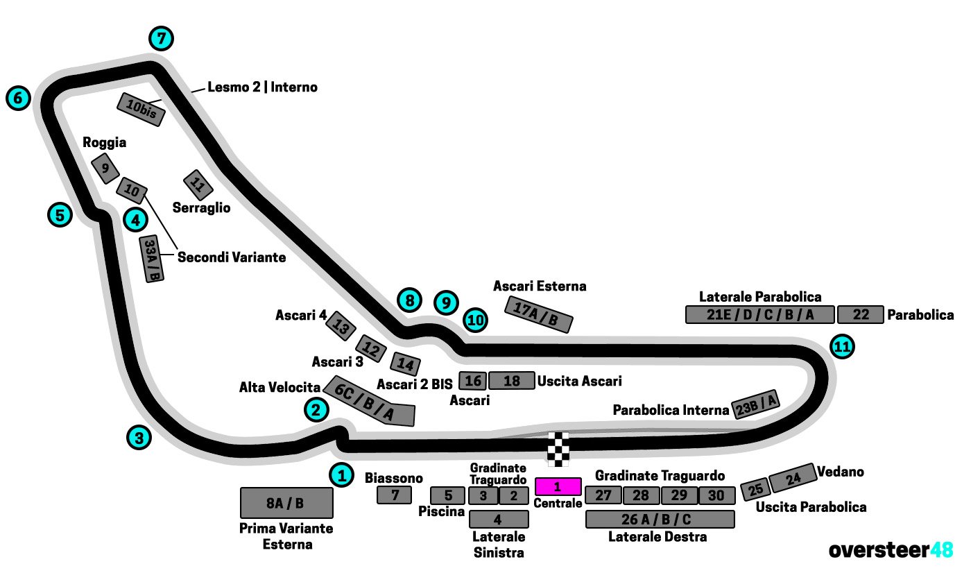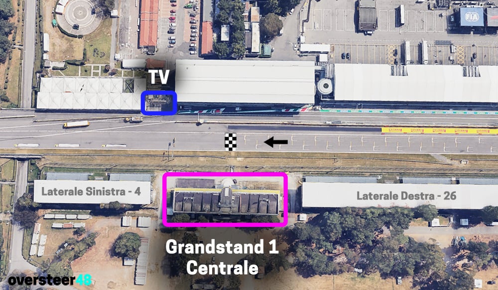At the Monza Italian Grand Prix, grandstand 1 Centrale (also known as the Central or Main grandstand or Tribuna Centrale) is half way along the start finish straight, on the left side of the circuit, directly in line with the start line. Hence why it’s called Centrale – it’s in the central position.