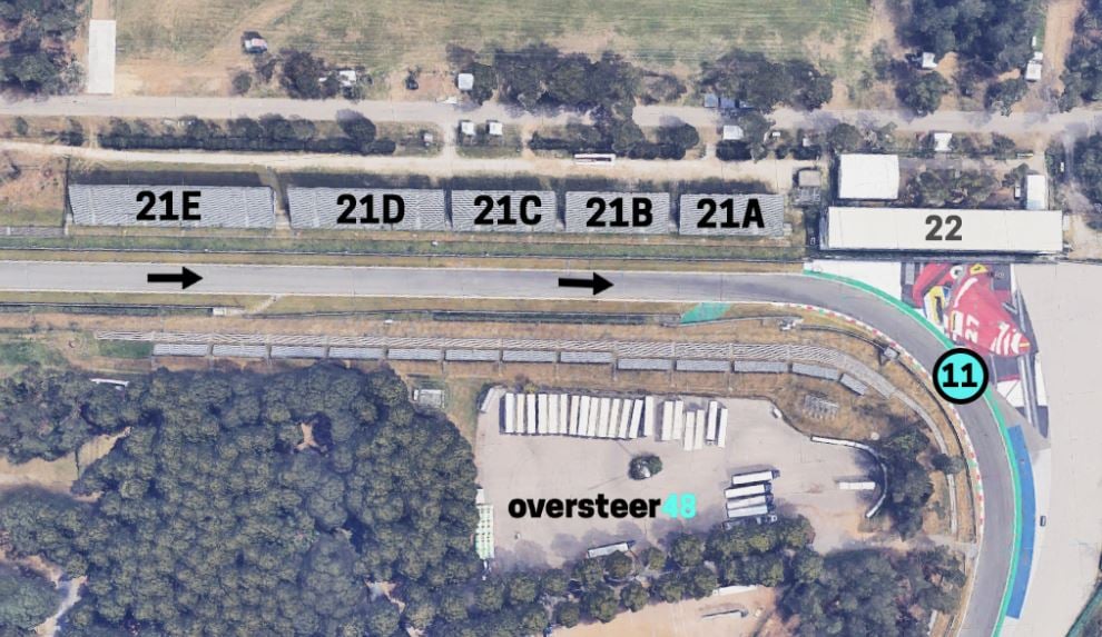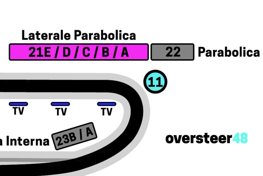 Turn 11 is the final corner on the circuit, the fearsomely fast Parabolica which leads on to the start / finish straight. Grandstand 21E is the furthest from the Turn 11 apex and grandstand 21A is closest to it. 21A is also adjacent to the covered Grandstand 22.