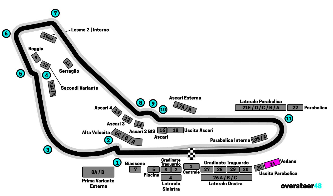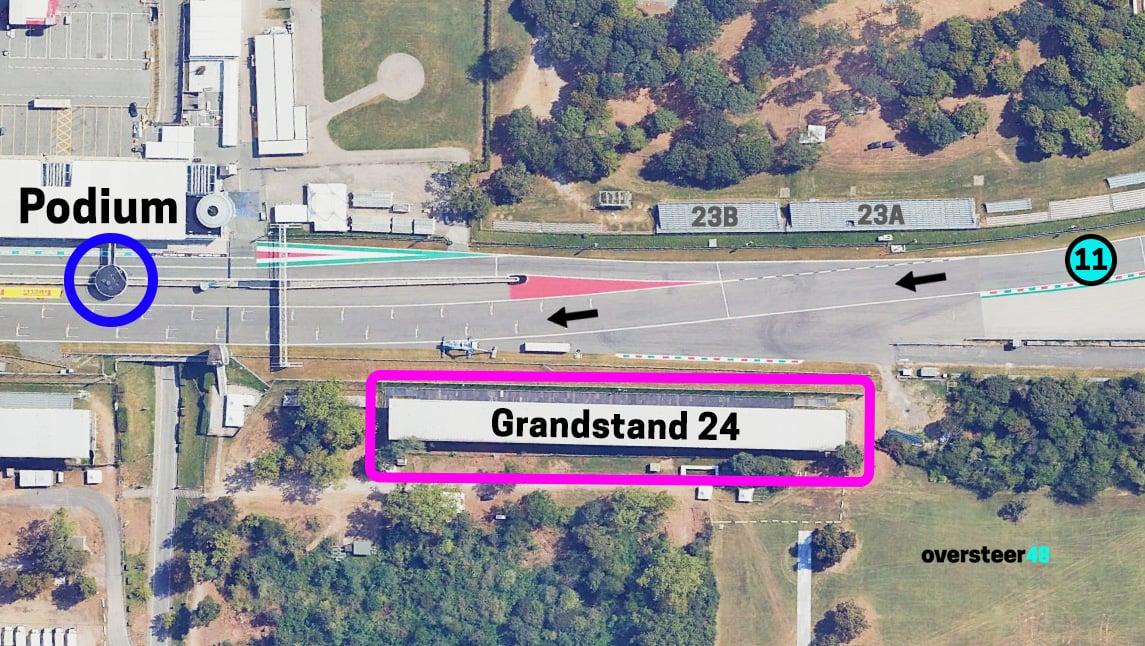 At the Monza Italian Grand Prix circuit, grandstand 24 Vedano (also known as Tribuna 24 Vedano) is located on the outside of the circuit at the end of the final corner Parabolica and at the beginning of the start / finish straight. It’s directly opposite the pit lane entrance and the smaller Grandstand 23.
