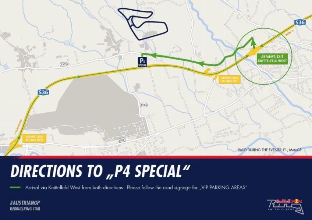 If you’re in Start – Ziel, Steiermark, Red Bull, T9 or T10 stands this carpark could be wortwhile as it’s only a 5 minute walk to the main entrance which is close to those grandstands. But the other grandstands are still a long way around the other side of the track and will involve some serious walking, negating the benefit of parking closer.