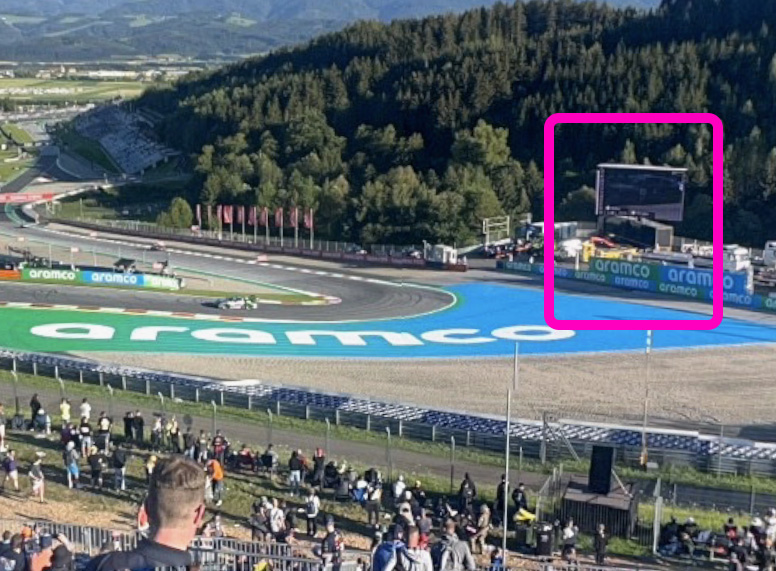 There’s one TV screen visible from this grandstand. It’s on the other side of Turn 3, so to the right as you look down the track at the cars coming towards you.