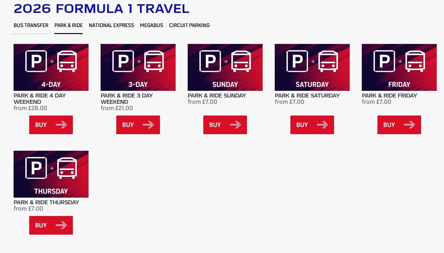 Silverstone park and ride prices for the F1 for a same-day return per adult start as follows, before pricing goes up after the 17th April: