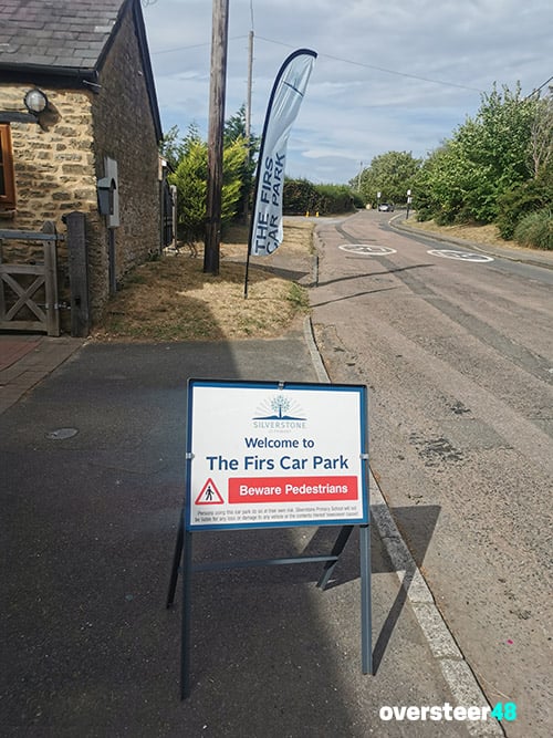 Located in Silverstone village, 10 to 15 minute walk from Copse corner. Book in advance, pay on the first day of parking. Cash preferred (dodgy signal for card machines).