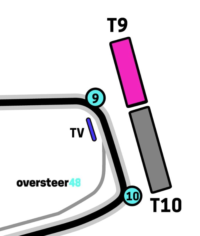 You’re unlikely to see any overtaking here at T9 or 10. Those corners are fast and usually single file. But you will get to see the cars cornerning at high speed, entering the pit lane, and you’re pretty close to the TV screen so that makes it easy to keep up with the action elsewhere on the track.